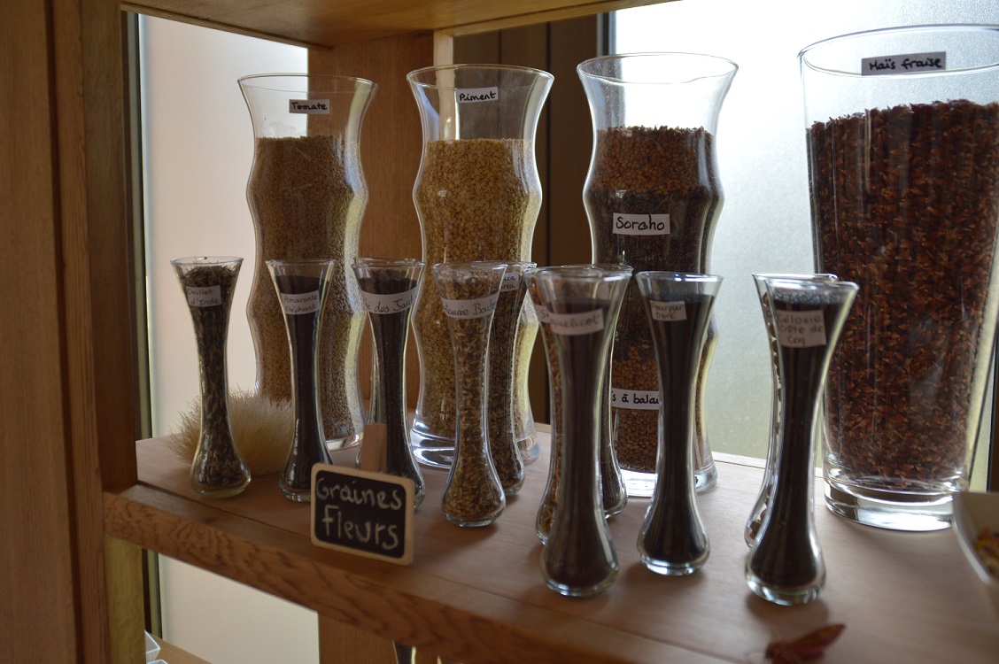 Cet espace offre donc à voir une magnifique collection de semences présentée dans des bocaux en verre. On peut venir les regarder, découvrir leurs propriétés et même les toucher car elles sont toutes de nature différente (certaines ressemblent à du bois, d’autres à du métal, d’autres encore à de la ouate, … c’est très surprenant). De plus, le conservatoire dispose de photos de fruits et légumes de variétés anciennes tous plus étonnants les uns que les autres (comme des tomates de différentes formes et de différentes couleurs). On s’aperçoit tout de suite que ce ne sont pas des fruits et légumes que l’on peut trouver au supermarché.