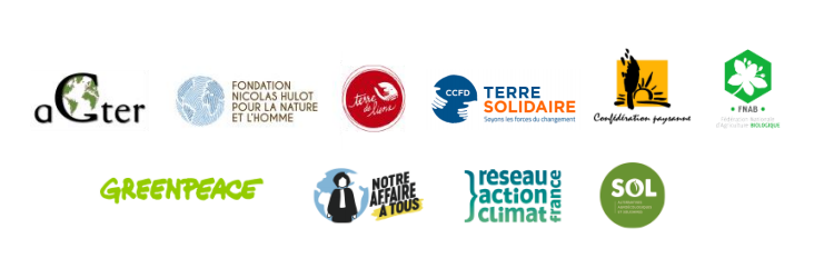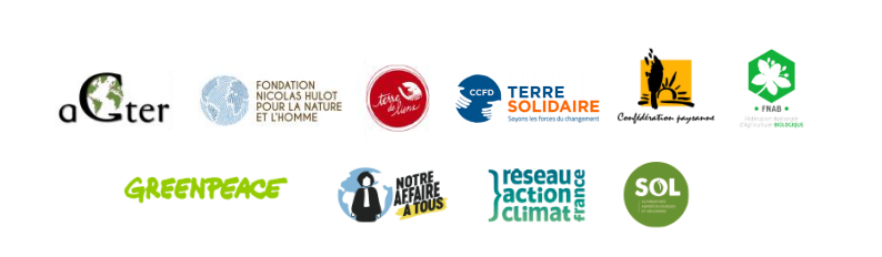 Association pour l’amélioration de la gouvernance de la terre, de l’eau et des ressources naturelles (AGTER), la Fondation Nicolas Hulot (FNH), Terre de Liens, CCFD-Terre Solidaire, la Confédération Paysanne, la Fédération Nationale d’agriculture biologique (FNAB), Greenpeace, Notre Affaire à Tous, le Réseau Action Climat, SOL Alternatives agroécologiques solidaires.