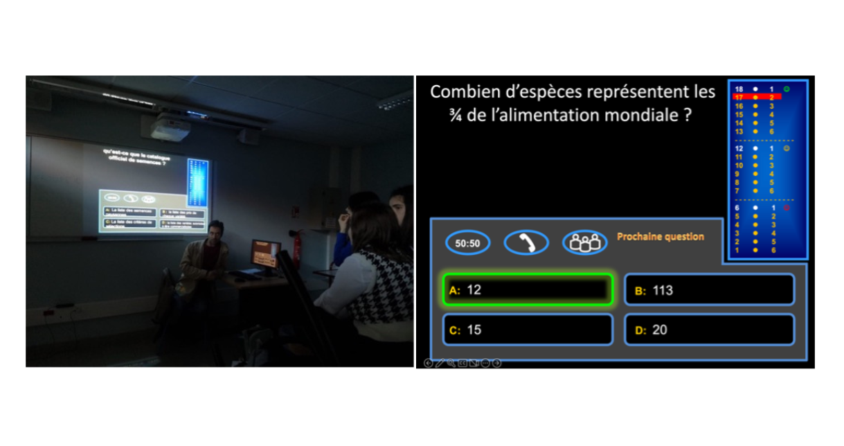 Les élèves ont ensuite été directement impliqués lors de la deuxième séance, en créant leur propre quiz sur les semences paysannes. Répartis en trois groupes thématiques, les élèves ont ainsi imaginé des questions que l’enseignant récoltait au fur et à mesure pour les ajouter sur un support numérique. Le résultat permet de jouer directement au jeu en affichant les questions et les différentes options de réponse, avec des visuels, animations et sons inspirés du jeu télévisé « Qui veut gagner des millions ». Les élèves ont pu jouer au quiz en fin de séance – non sans enthousiasme !